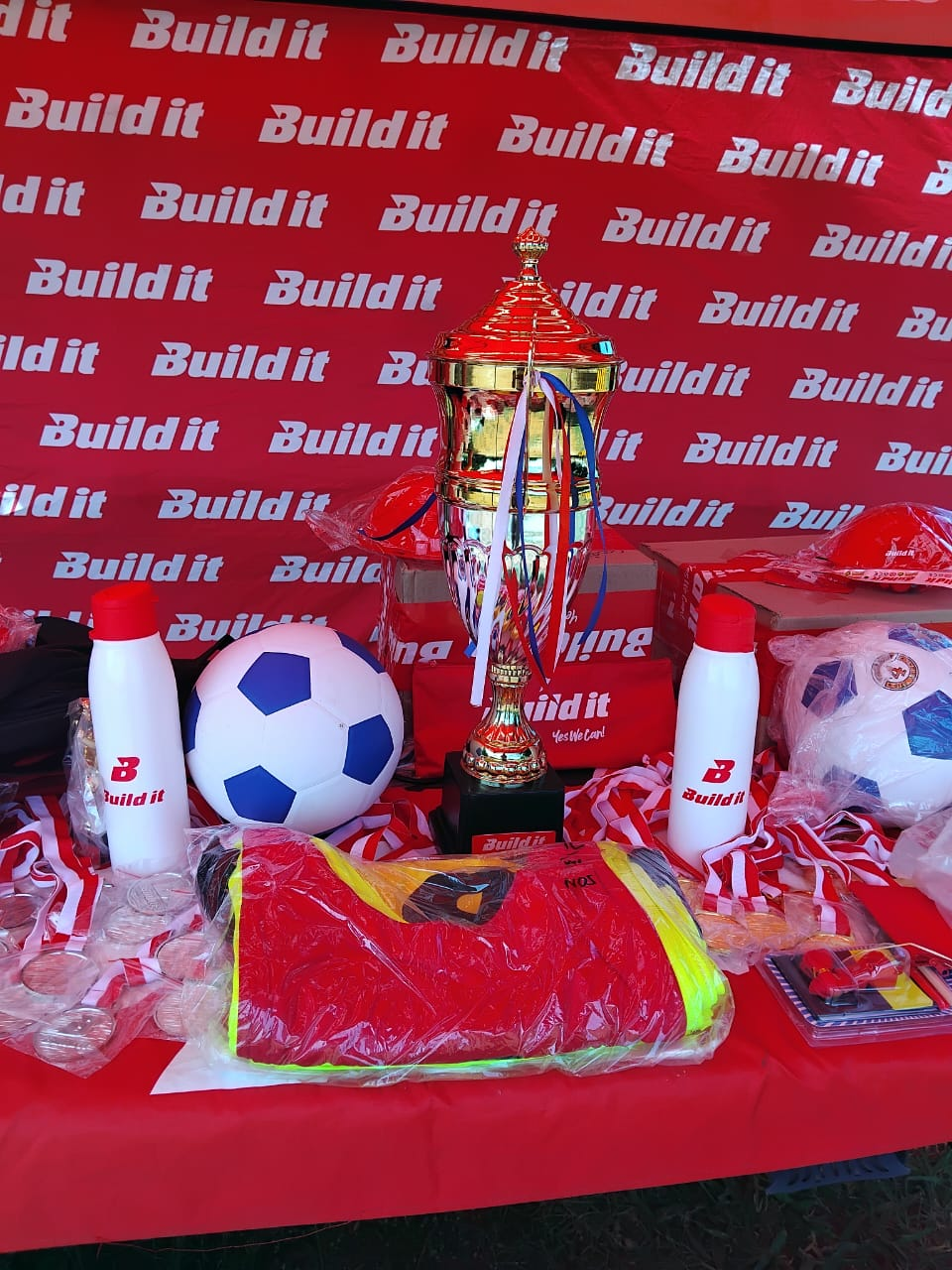 They received a soccer kit, sports bag, soccer ball, medals, water bottle, cap, training bibs, and a trophy.