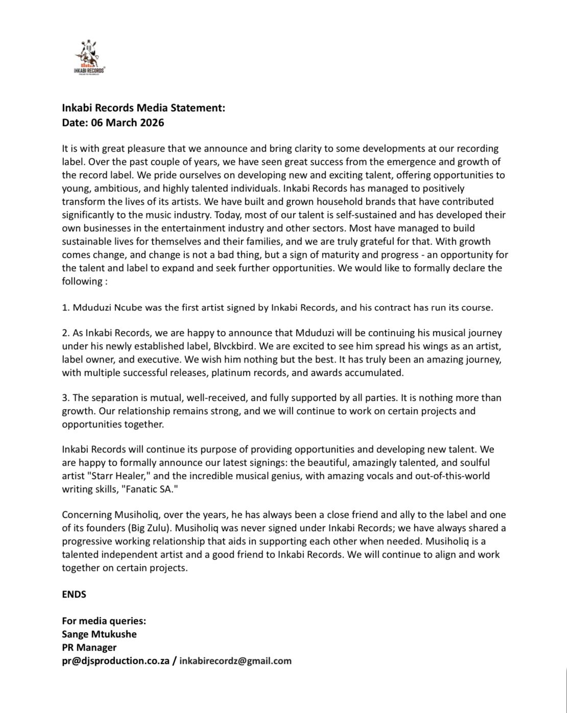 “Mduduzi Ncube was the first artist signed by Inkabi Records, and his contract has run its course. As Inkabi Records, we are happy to announce that Mduduzi will be continuing his musical journey under his newly established label, Blackbird. We are excited to see him spread his wings as an artist, label owner, and executive. We wish him nothing but the best. It has truly been an amazing journey, with multiple successful releases, platinum records, and awards accumulated,” she said.