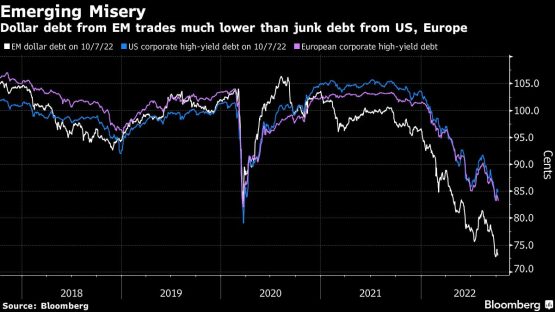 Pressure on EM currencies and bonds will proceed at the least via mid-2023, after which greenback power may ease, Deutsche Bank strategists led by Chief Economist Michael Spencer wrote in a notice revealed Oct. 10. They spotlight Bulgaria and Turkey amongst nations with greater than half their debt in foreign currency and counsel that investor losses are already sufficiently big to qualify a crisis.