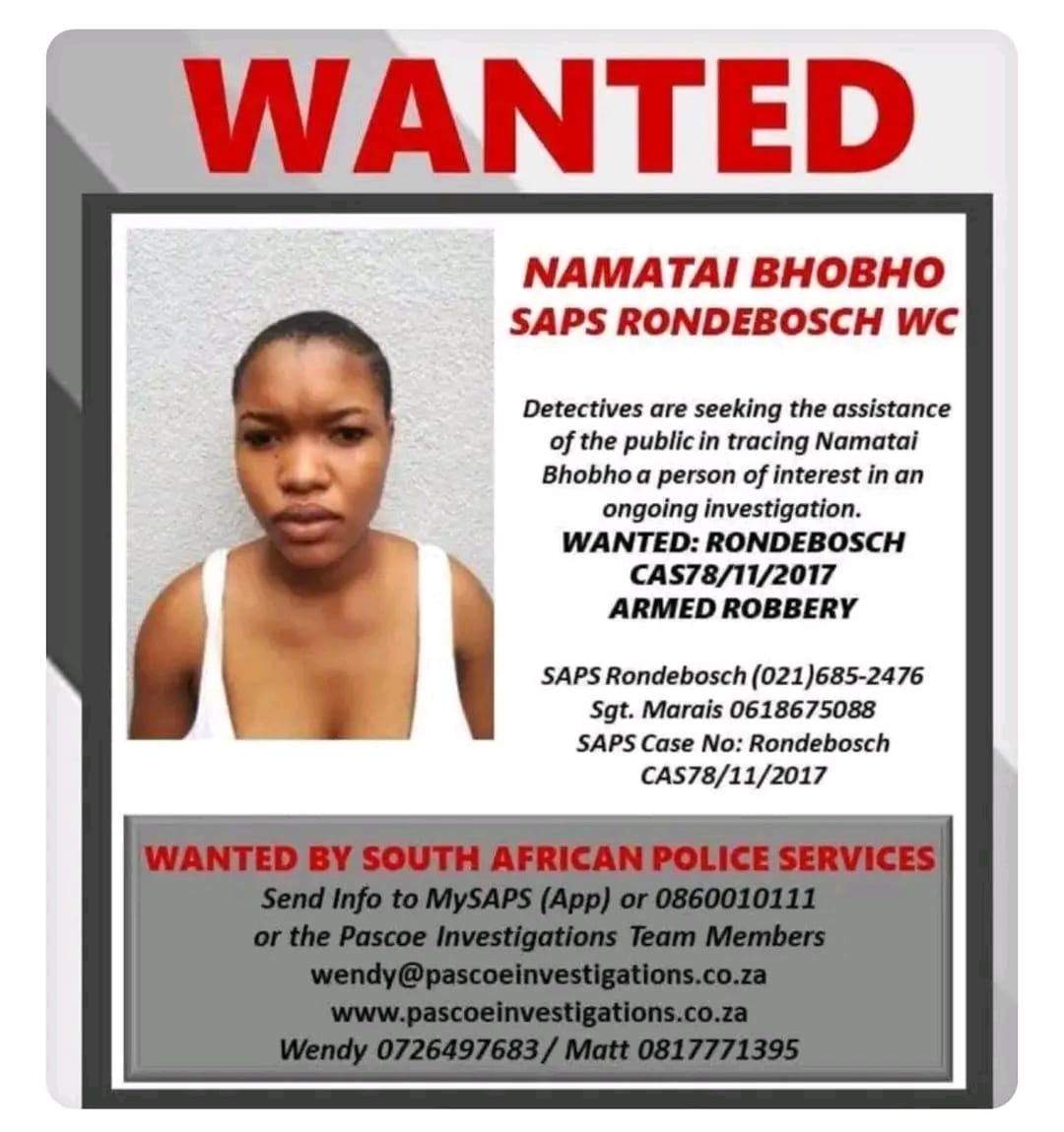 According to SAPS records referenced in recent reporting, a warrant of arrest for Namatai Bhobho was issued on January 19, 2018, at the Wynberg Magistrate’s Court. The warrant reportedly requires that she be arrested and brought before court on charges related to armed robbery.