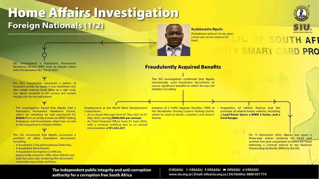 According to SIU Spokesperson Kaizer Kganyago, the latter is accused of using their influence, fabricated documentation, and manipulated systemic weaknesses to secure fraudulent residence permits.